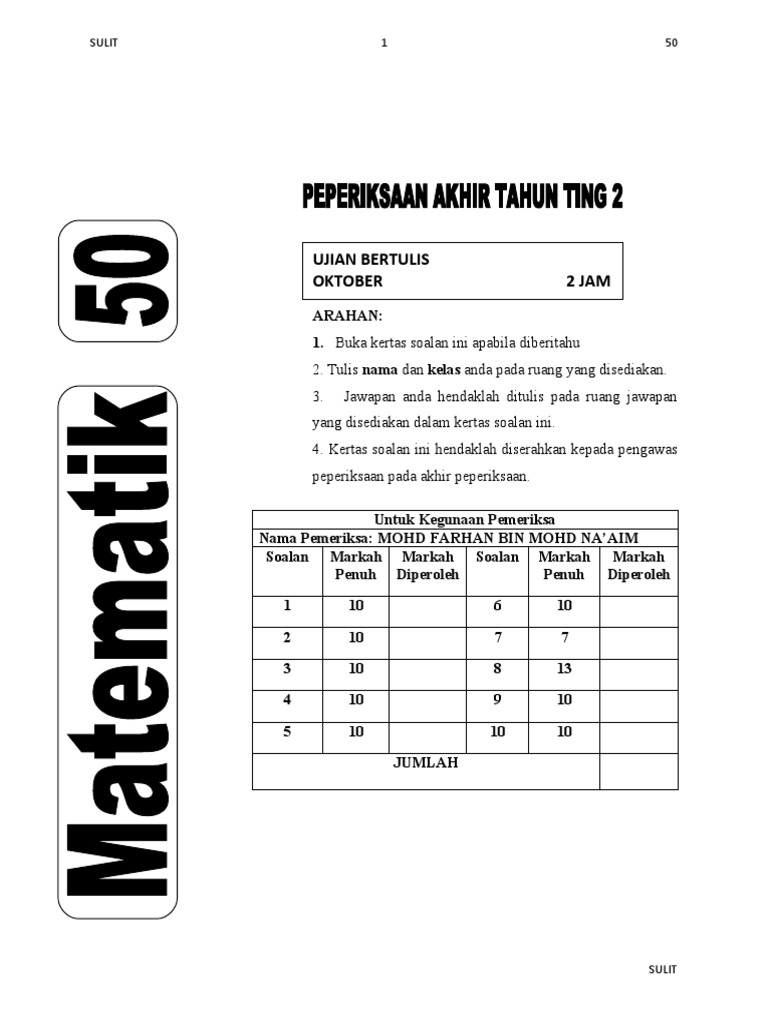 Matematik Contoh Kertas Soalan Form 2 Kssm